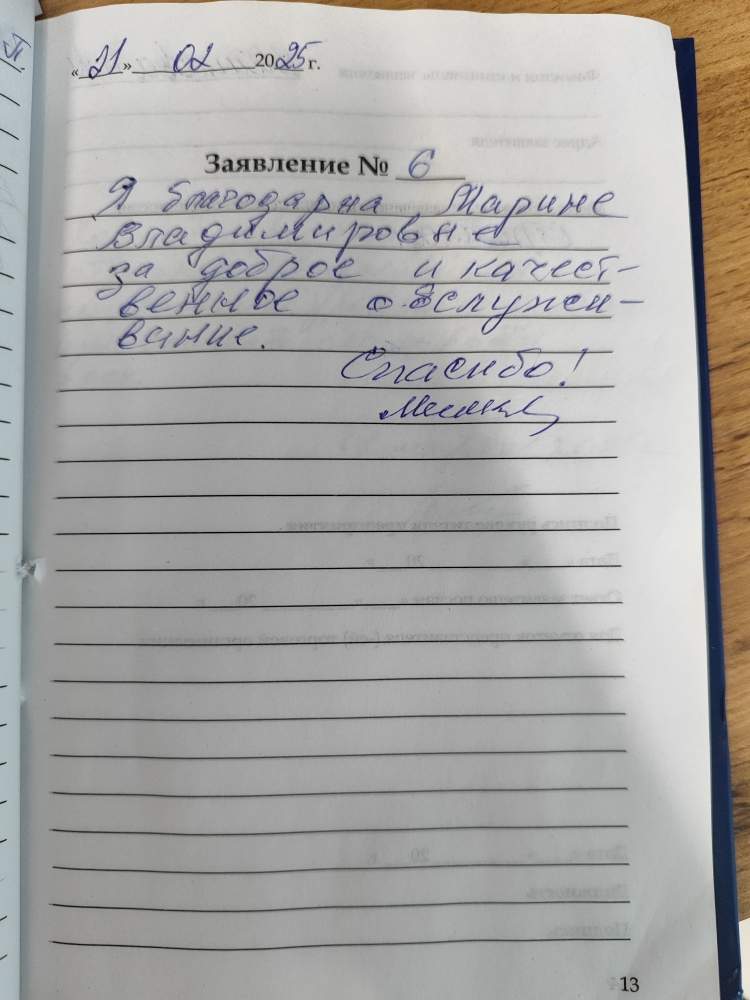 Я благодарна Марине Владимировне за доброе и качественное обслуживание. Спасибо!