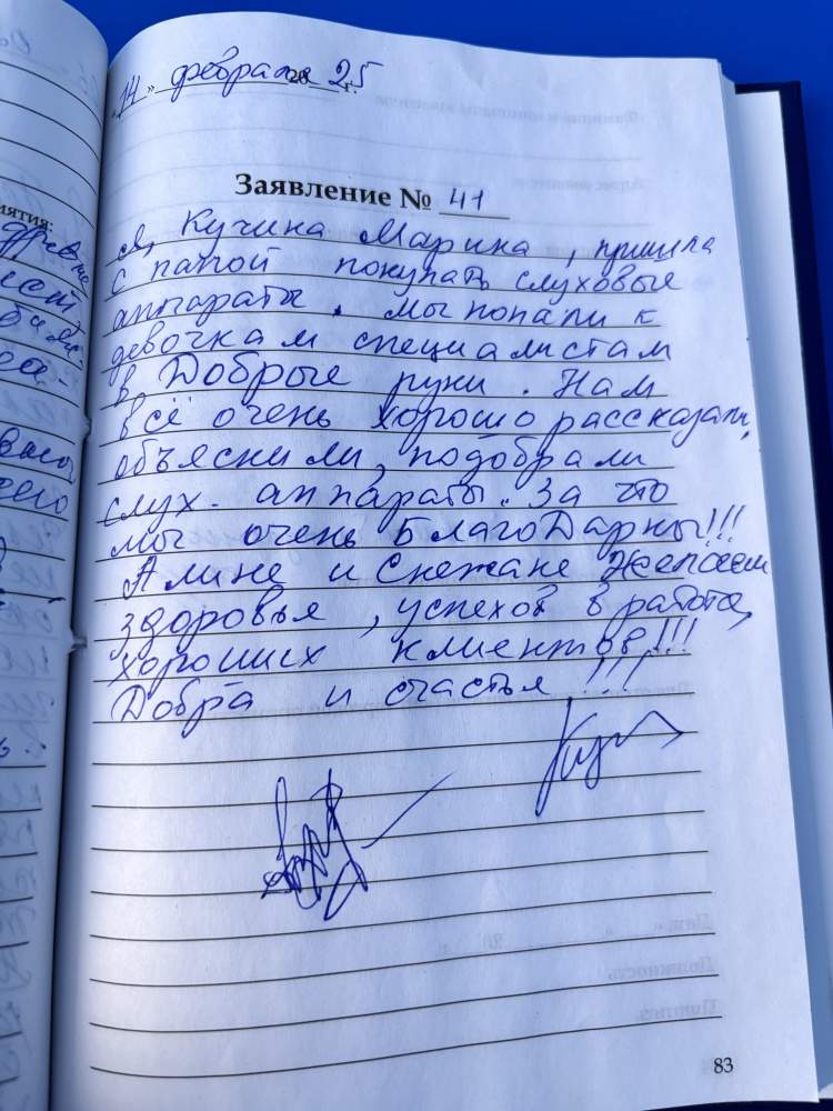Я, Кучина Марина, пришла с папой покупать слуховые аппараты. Мы попали к девочкам специалистам в добрые руки. Нам всё очень хорошо рассказали, объяснили, подобрали слух. аппараты. За что мы очень благодарны!!! Алине и Снежане желаем здоровья, успехов в работе, хороших клиентов!!! Добра и счастья!!!