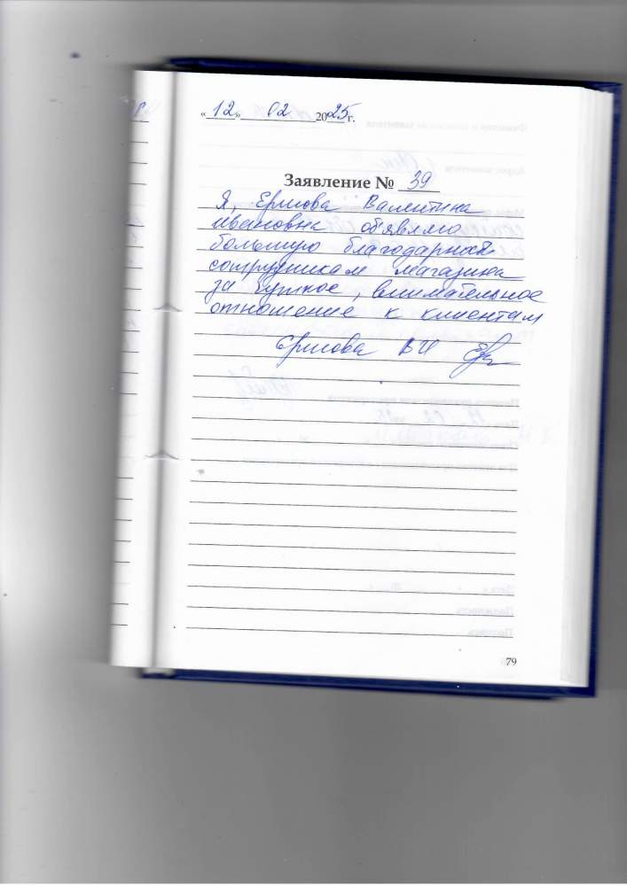 Я,Ершова Валентина Ивановна ,объявляю большую благодарность сотрудникам магазина за чуткое ,внимательное отношение клиентам.
