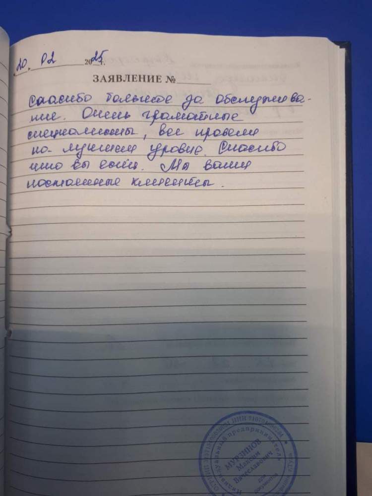 Спасибо большое за обслуживание.Очень грамотные специалисты,все провели на лучшем уровне.Спасибо что вы есть.Мы ваши постоянные клиенты.