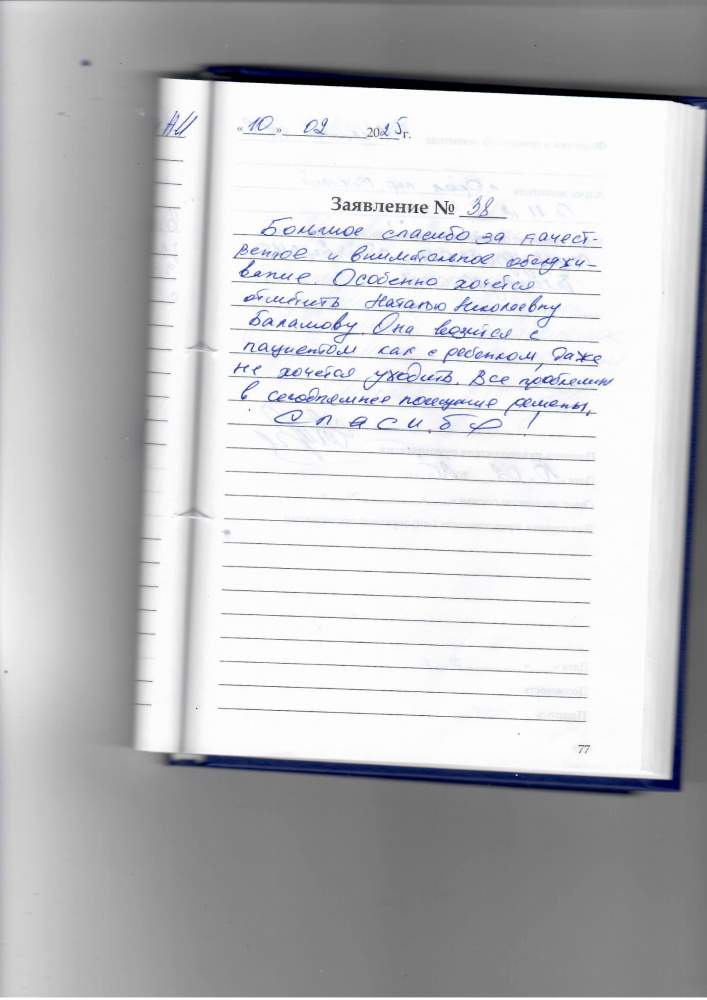 Большое спасибо за качественное и внимательное обслуживание . Особенно хочется отметить Наталью Николаевну Балашову . Она возится с пациентом как с ребенком ,даже не хочется уходить. Все проблемы на сегодняшнем посещении решены.