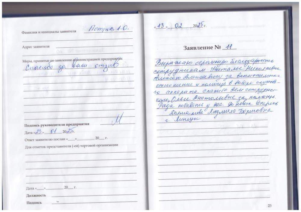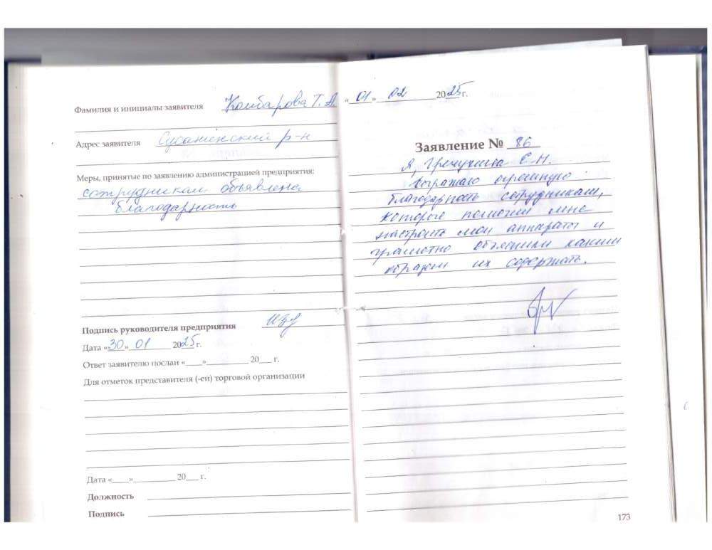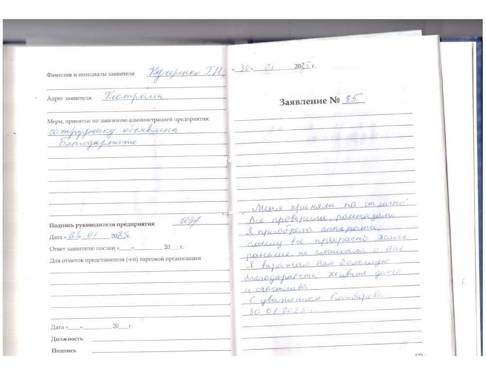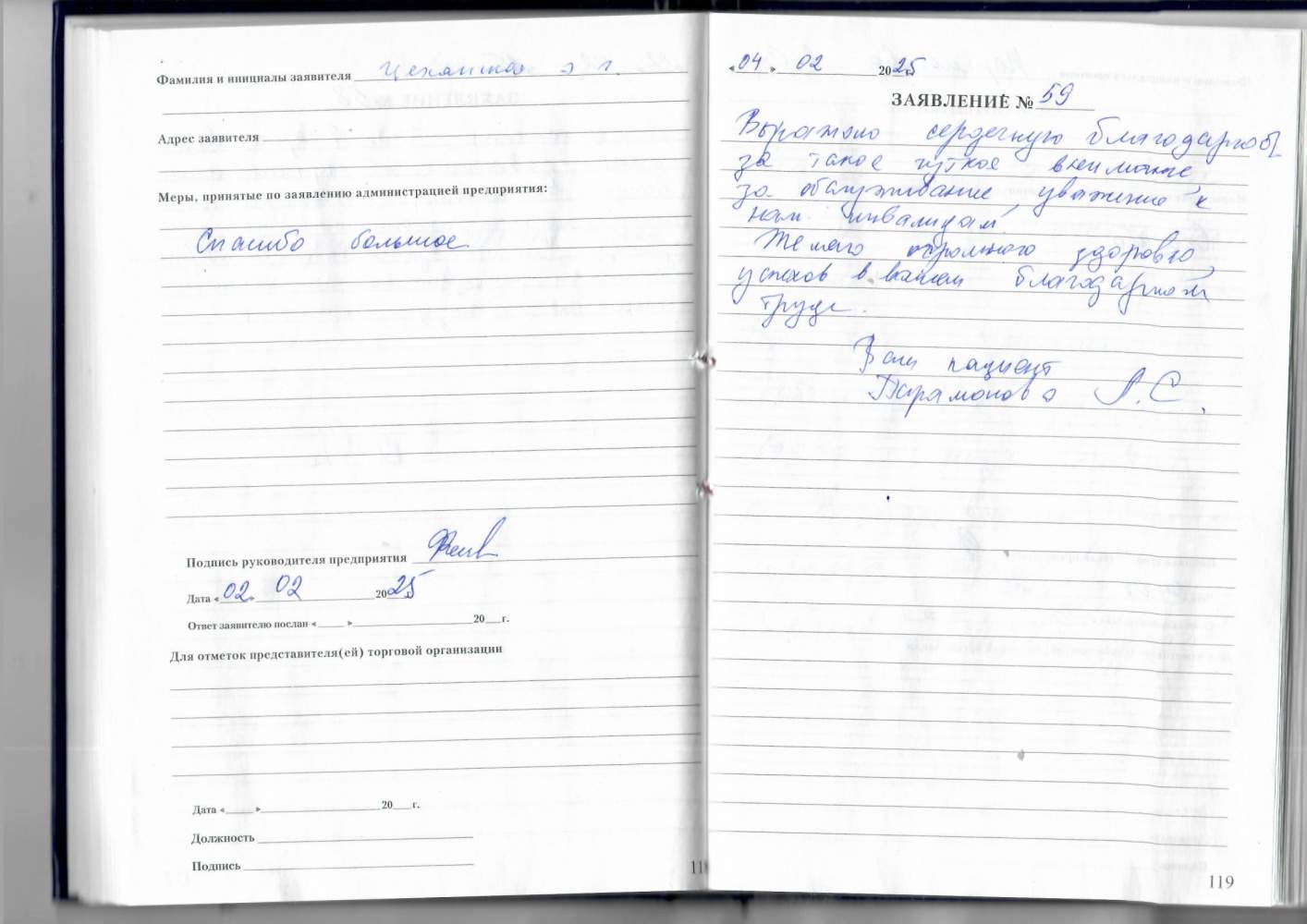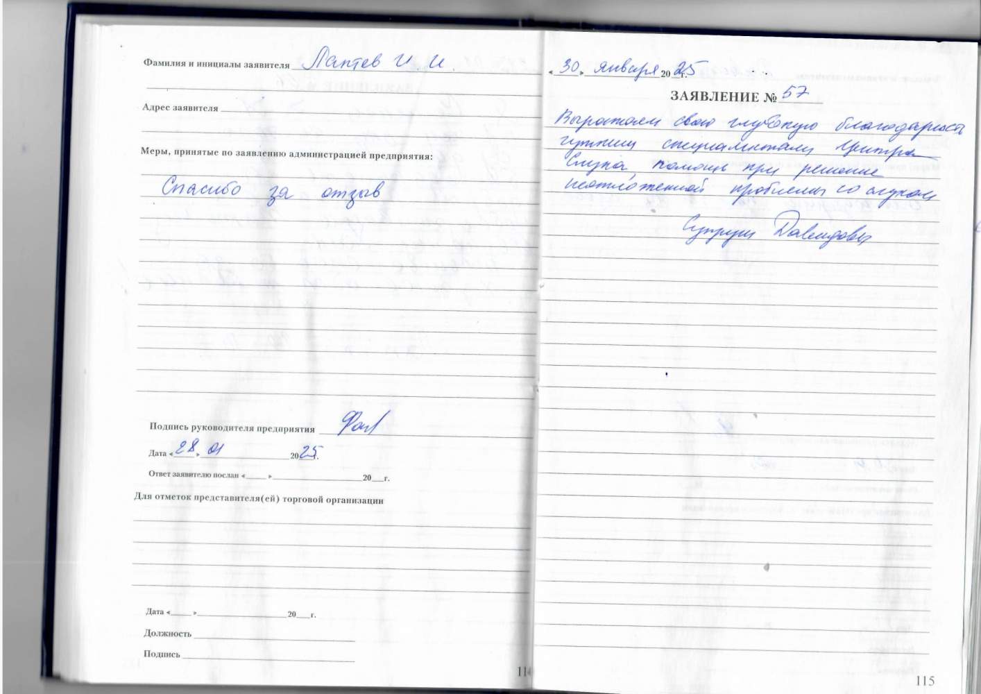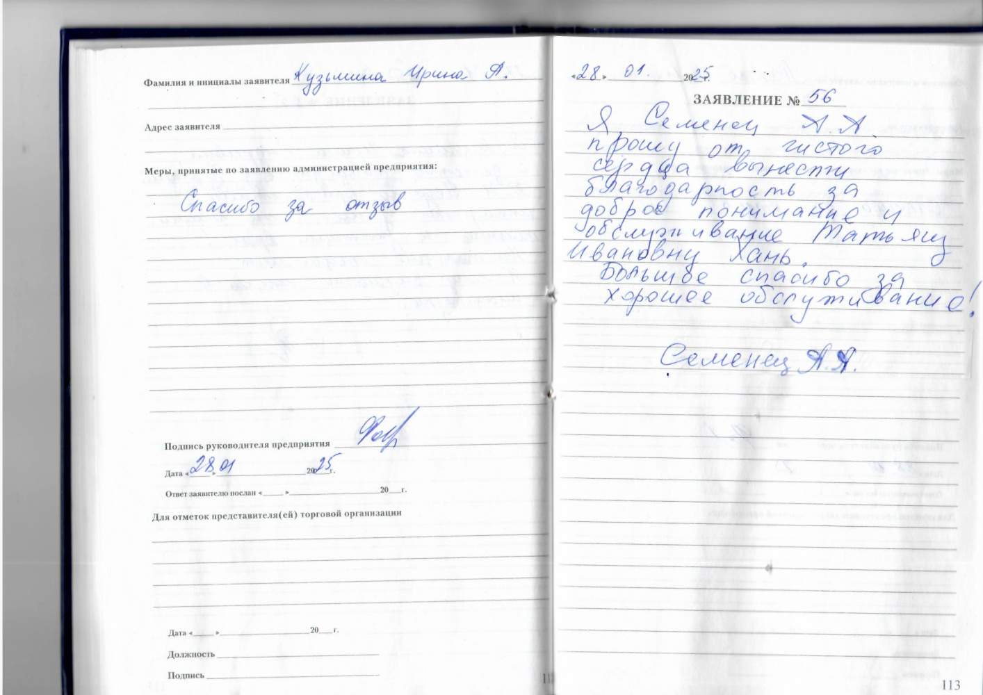 Я Семенец А.А. прошу от чистого сердца вынести благодарность за доброе понимание и обслуживание Татьяну Ивановну Хань. Большое спасибо за хорошее обслуживание!