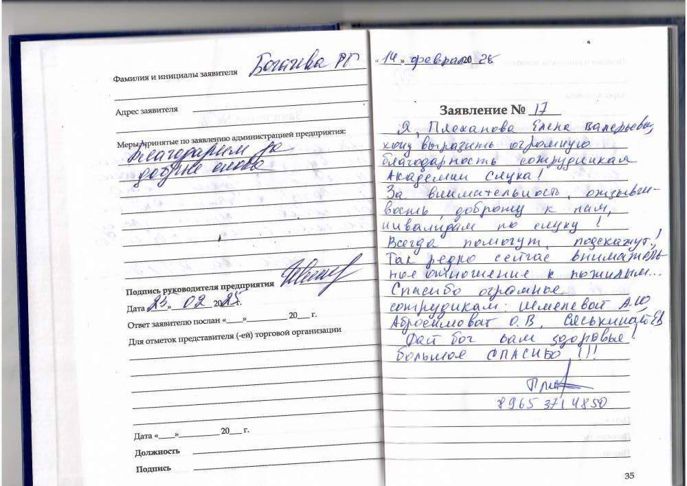 Я, Плеханова Елена Валерьевна, хочу выразить огромную благодарность сотрудникам Академии Слуха! За внимательность, отзывчивость, доброту к нам, инвалидам по слуху, Всегда помогут, подскажут! Так редко сейчас внимательное отношение к пожилым... Спасибо огромное Шмелёвой А.Ю., Абросимовой О.В., Сяськиной Е.В. Дай Бог Вам здоровья! Больше спасибо!!!