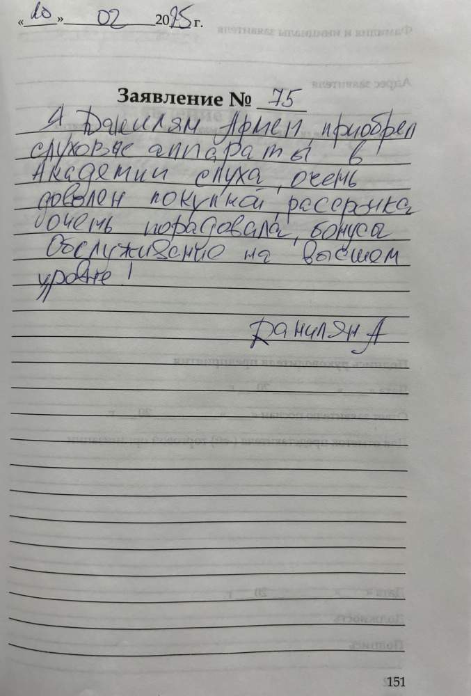 Я, Данилян Армен, приобрел слуховые аппараты в «Академии слуха», очень доволен покупкой, рассрочка очень порадовала, бонусы. Обслуживание на высшем уровне!