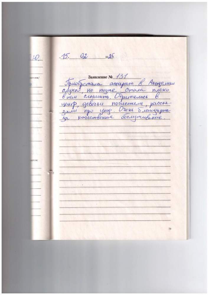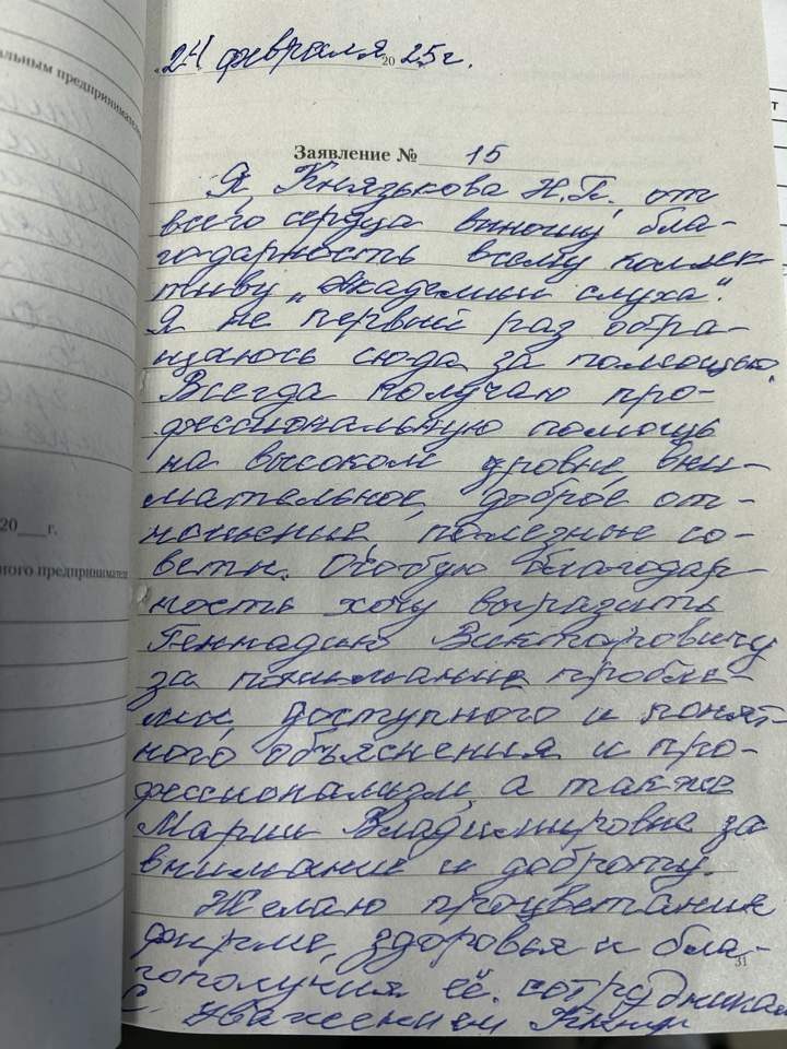 Я Князькова Н.П. от всего сердца выношу благодарность всему коллективу «Академия слуха». Я не первый раз обращаюсь сюда за помощью. Всегда получаю профессиональную помощь на высоком уровне, внимательное, доброе отношение, полезные советы. Особую благодарность хочу выразить Геннадию Викторовичу за понимание проблемы, доступного и понятного объяснения и профессионализм, а также Марии Владимировне за внимание и доброту. Желаю процветание фирме, здоровья и благополучия её сотрудникам С уважением Князькова.