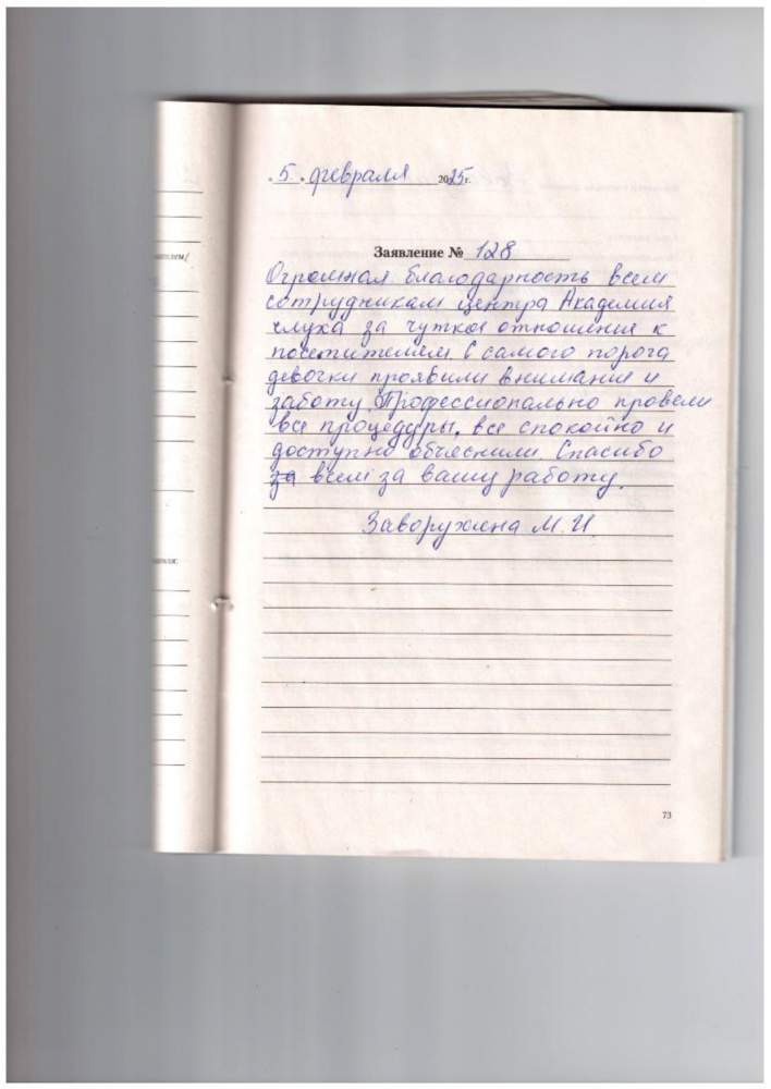 Огромная благодарность всем сотрудникам Академия слуха за чуткое отношение к посетителям. С самого порога девочки проявили внимание и заботу. Профессионально провели все процедуры, все спокойно и доступно объяснили.Спасибо всем за вашу работу. Заворухина М.И.