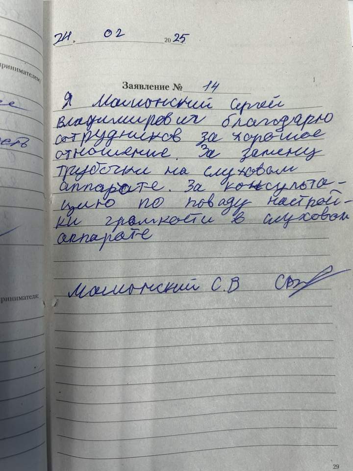 Я Машонский Сергей Владимирович благодарю сотрудников за хорошее отношение. За замену трубочки на слуховом аппарате. За консультацию по поводу настройки громкости в слуховом аппарате. Машонский С.В.