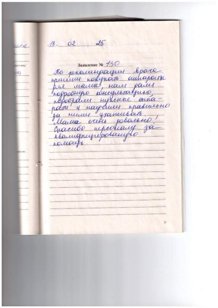 По рекомендации врача пришли покупать аппараты для мамы, нам дали подробную консультацию, подобрали нужные аппараты и научили правильно за ними ухаживать.Мама очень довольно! Спасибо персоналу за квалифицированую помощь.