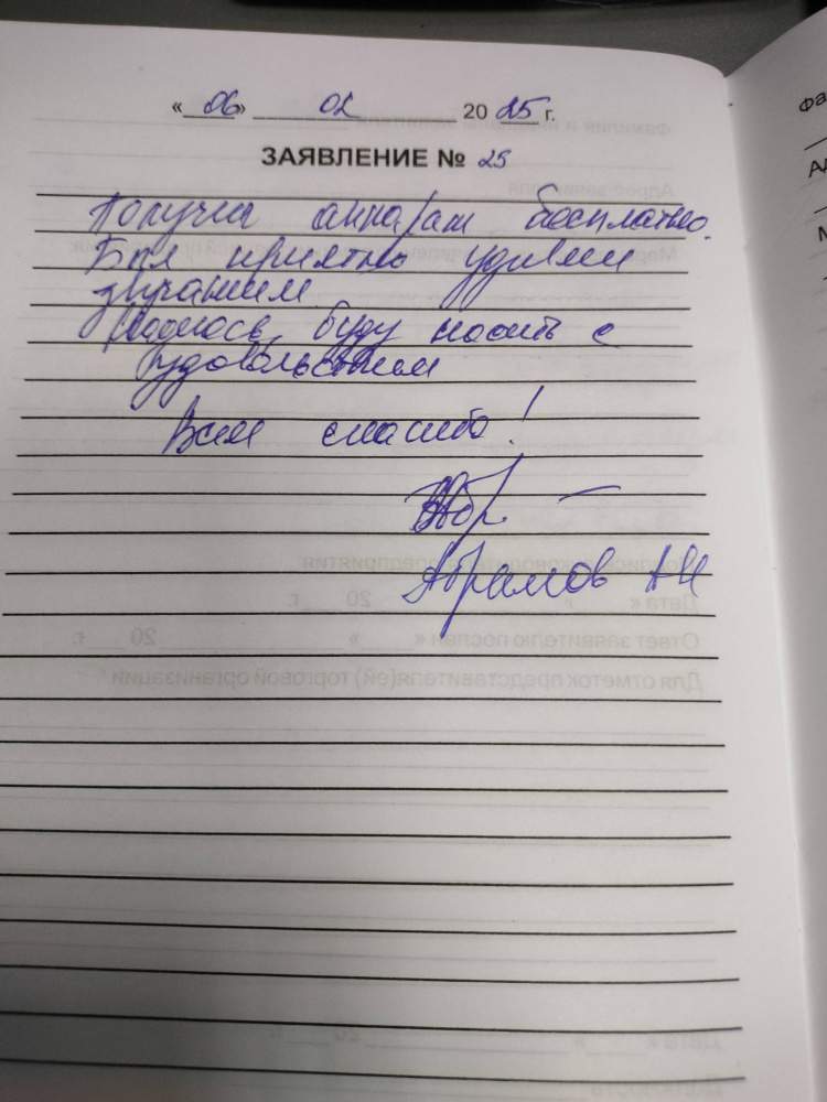Очень приветливые сотрудники. Всегда помогут, все объяснят. Спасибо, что помогаете пенсионерам! Купили аппарат несколько лет назад мне и моему другу. Ходим только к вам.
