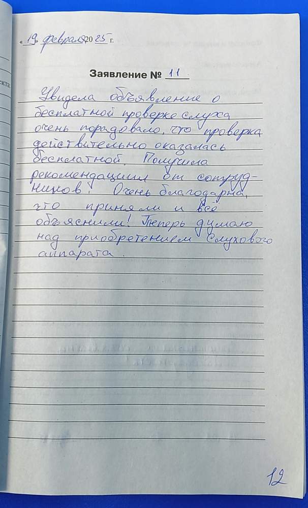 Увидела объявление о бесплатной проверке слуха. Очень порадовало, что проверка действительно оказалась бесплатной. Получила рекомендации от сотрудников. Очень благодарна, что приняли и все объяснили! Теперь думаю над приобретением слухового аппарата.