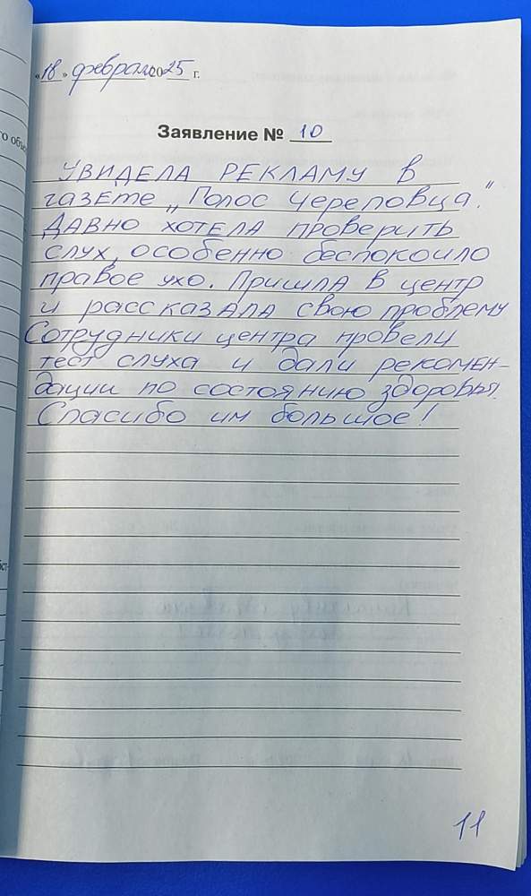 Увидела рекламу в газете "Голос Череповца". Давно хотела проверить слух, особенно беспокоило правое ухо. Пришла в центр и рассказала свою проблему.