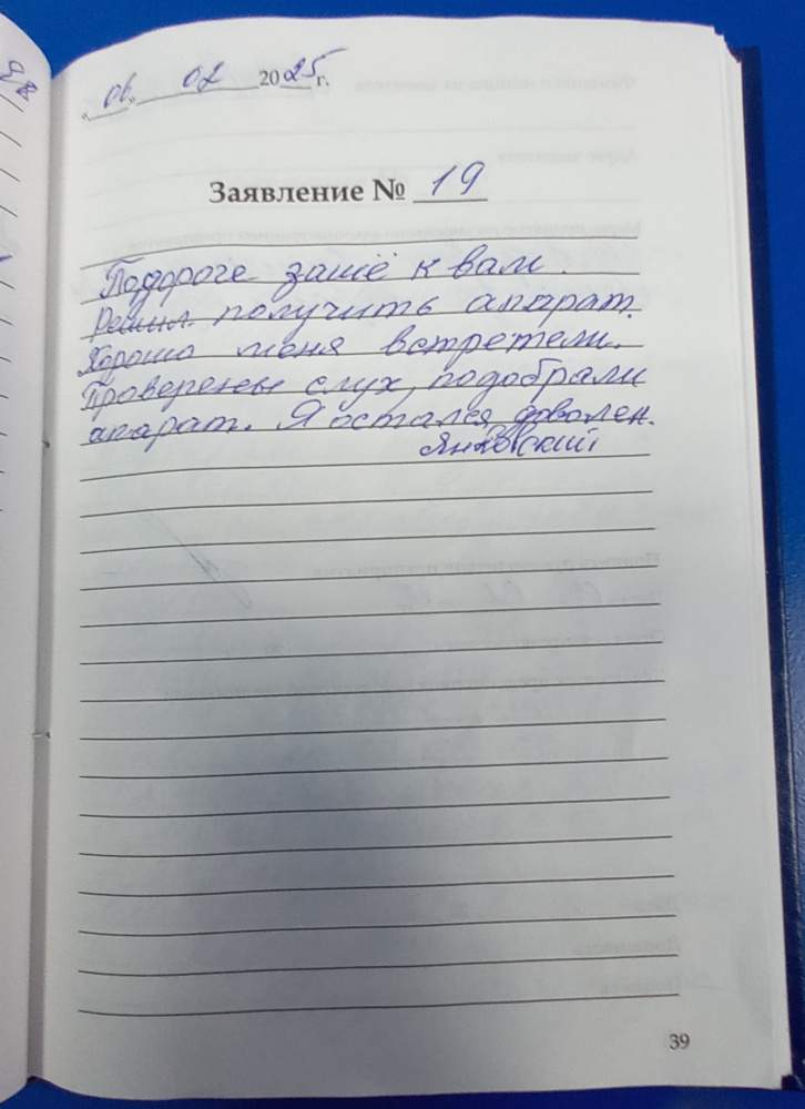 По дороге зашел к Вам, решил получить аппарат. Хорошо меня встретили. Проверены слух, подобрали аппарат. Я остался доволен. Янковский.