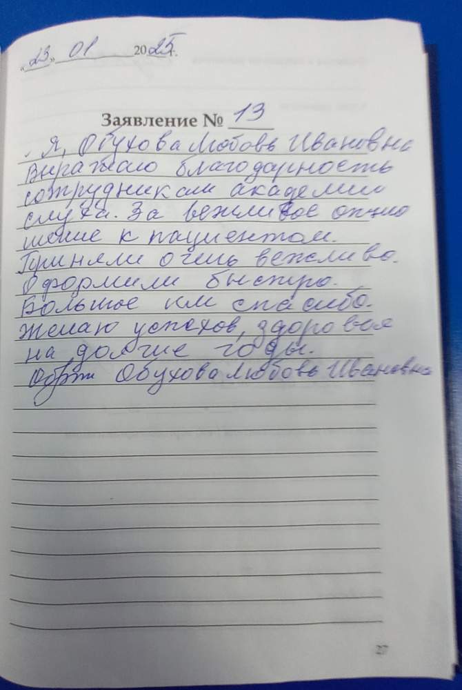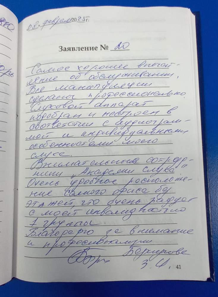 Самое хорошее впечатление об обслуживании. Все манипуляции сделаны профессионально. Слуховой аппарат подобран и настроен а соответствии с аудиограммой и индивидуальными особенностями моего слуха. Внимательные сотрудники "Академии Слуха". Очень удобное расположение самого офиса , без этажей , что очень радует с моей инвалидностью 1 группы. Благодарю за внимание и профессионализм. Беркунова З.И.