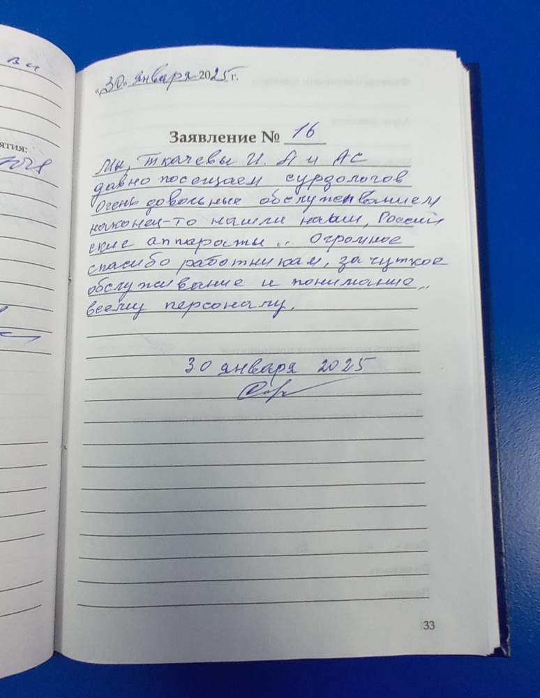 Мы, Ткачевы И.А и А.С. давно посещаем сурдологов. Очень довольны обслуживанием. Наконец-то нашли наш, Российские аппараты. Огромное спасибо работникам за чуткое обслуживание и понимание, всему персоналу.