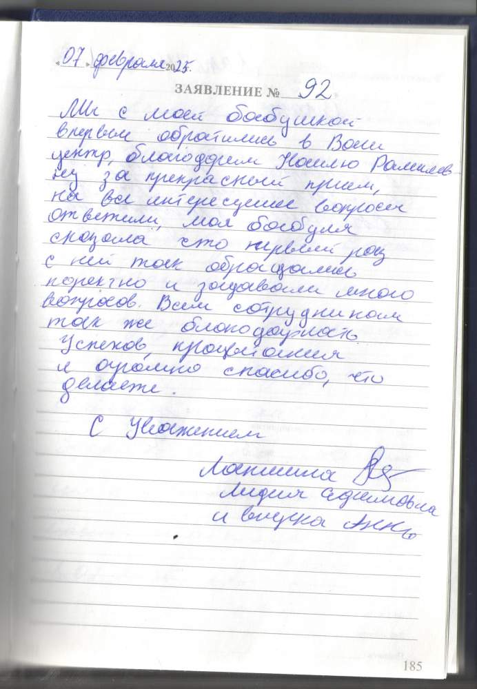 Мы с моей бабушкой впервые обратились в Ваш центр, благодарим Наилю Рамилевну за прекрасный прием, на все интересующие вопросы ответили. Моя бабуля сказала, что первый раз с ней так обращались корректно и задавали много вопросов. Всем сотрудникам также благодарность. Успехов, процветания и огромное спасибо, что делаете. С уважением Лапшина Лидия Ефимовна и внучка Анна