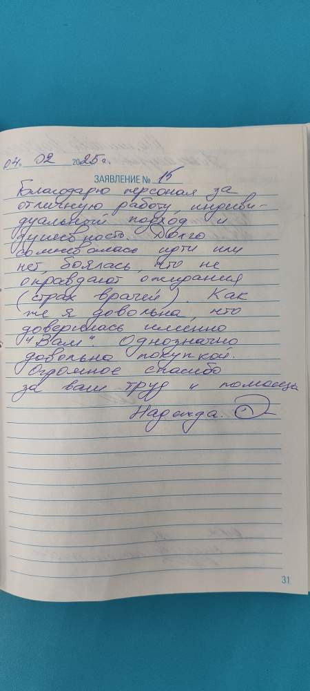 Благодарю персонал за отличную работу, индивидуальный подход и душевность. долго сомневалась идти или нет, боялась, что не оправдают ожидания (страх врачей). как же я довольна, что доверилась именно "Вам". Однозначно довольна покупкой.