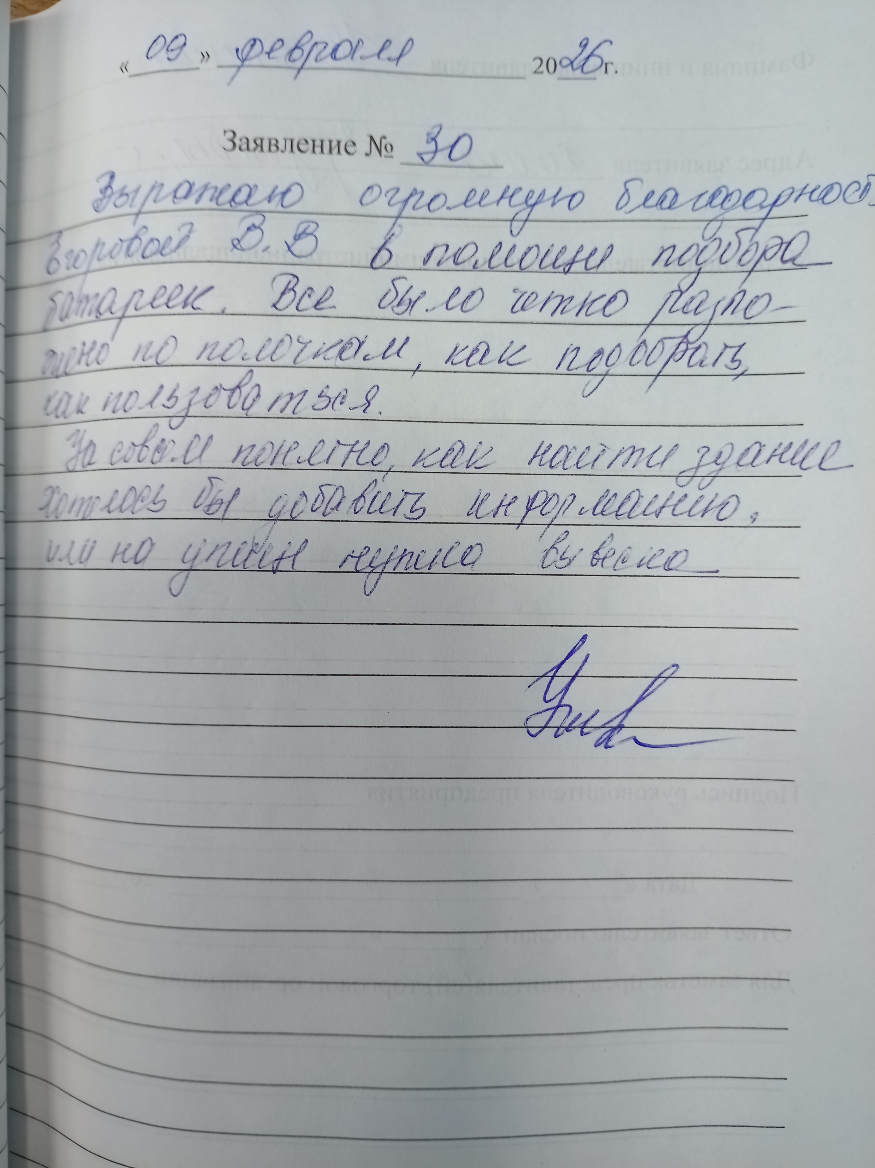 Выражаю огромную благодарность Егоровой В.В. в помощи , в подборе батареек. Все было четко разложено по полочкам: как подобрать и как пользоваться. Не совсем понятно как найти здание, хотелось бы добавить информацию или на улице нужна вывеска.