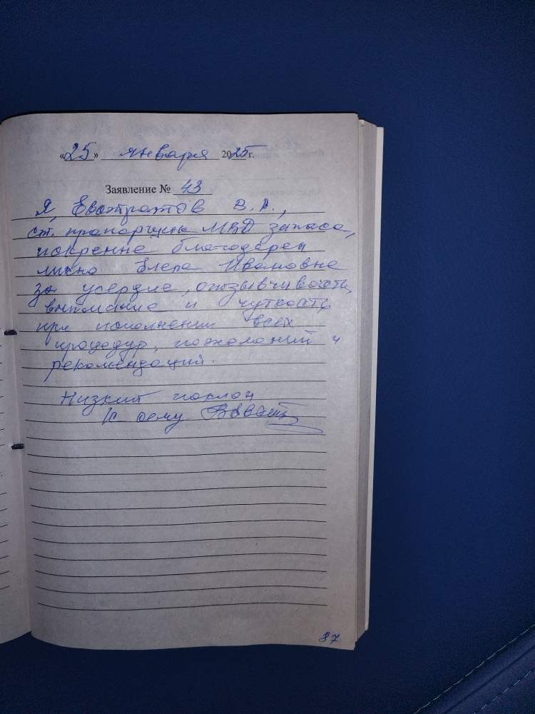 Я, Евстратов Владимир Анатольевич старший прапорщик МВД запаса, искренне благодарен лично Елене Ивановне за усердие, отзывчивость внимание и чуткость при выполнении всех процедур, пожеланий и рекомендаций