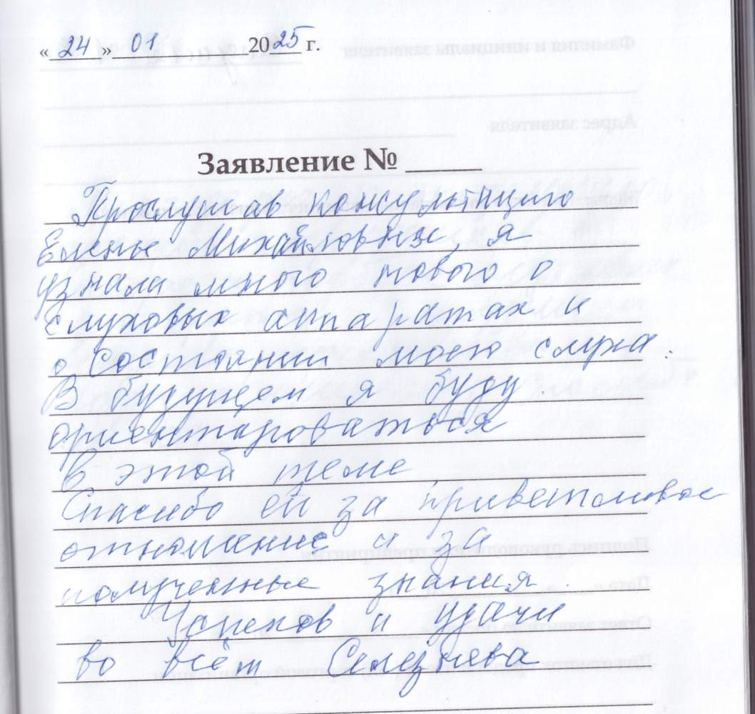 Прослушав консультацию Елены Михайловны, я узнала много нового о слуховых аппаратах и о состоянии моего слуха. В будущем я буду ориентироваться в этой теме. Спасибо ей за приветливое отношение и за полученные знания. Успехов и удачи во всём.