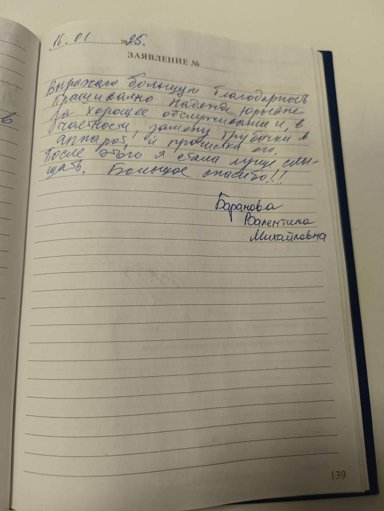 Пришла к Вам поменять трубочку на индивидуальном вкладыше. Приветливые продавцы все сделали быстро и качественно. Я очень довольна.