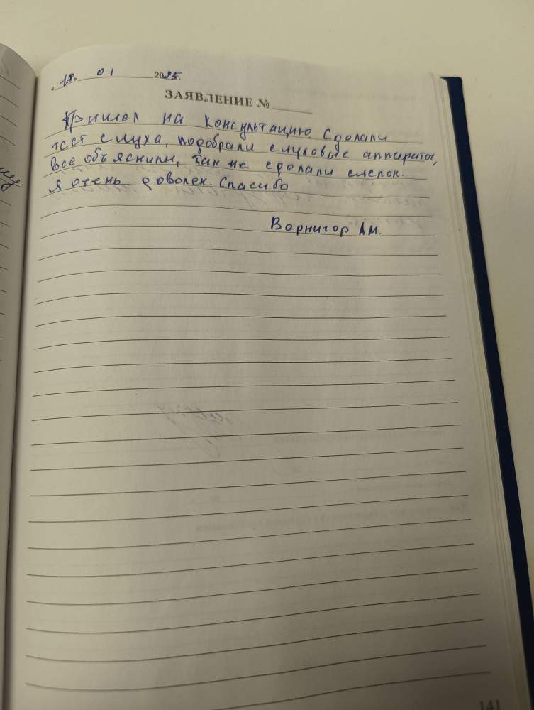 Пришел на консультацию. Сделали тест слуха,подобрали слуховые аппараты,все объяснили, также сделали слепок. Я очень доволен. Спасибо.