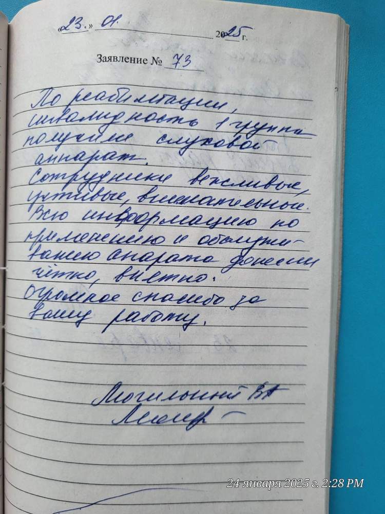 По реабилитации, инвалидность 1 группы получил слуховой аппарат. Сотрудники вежливые, учтивые, внимательные. Всю информацию по применению и обслуживанию аппарата донесли чётко, внятно. Огромное спасибо за вашу работу.