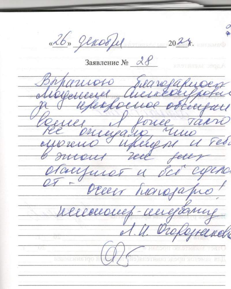 Выражаю благодарность Людмиле Александровне за прекрасное обслуживание .Я даже такого не ожидала ,что можно прийти и тебя в этот же день обслужат и все сделают .Очень благодарю! Пенсионер-инвалид Л.И. Огородникова