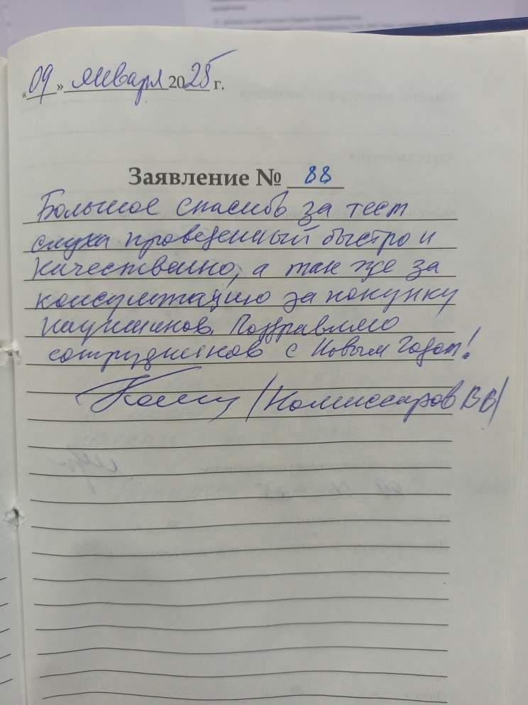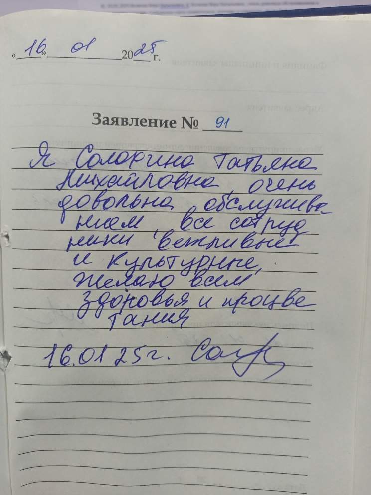 Я, Солохина Татьяна Михайловна, очень довольна обслуживанием, все сотрудники вежливые и культурные. Желаю всем здоровья и процветания. 16.01.2025