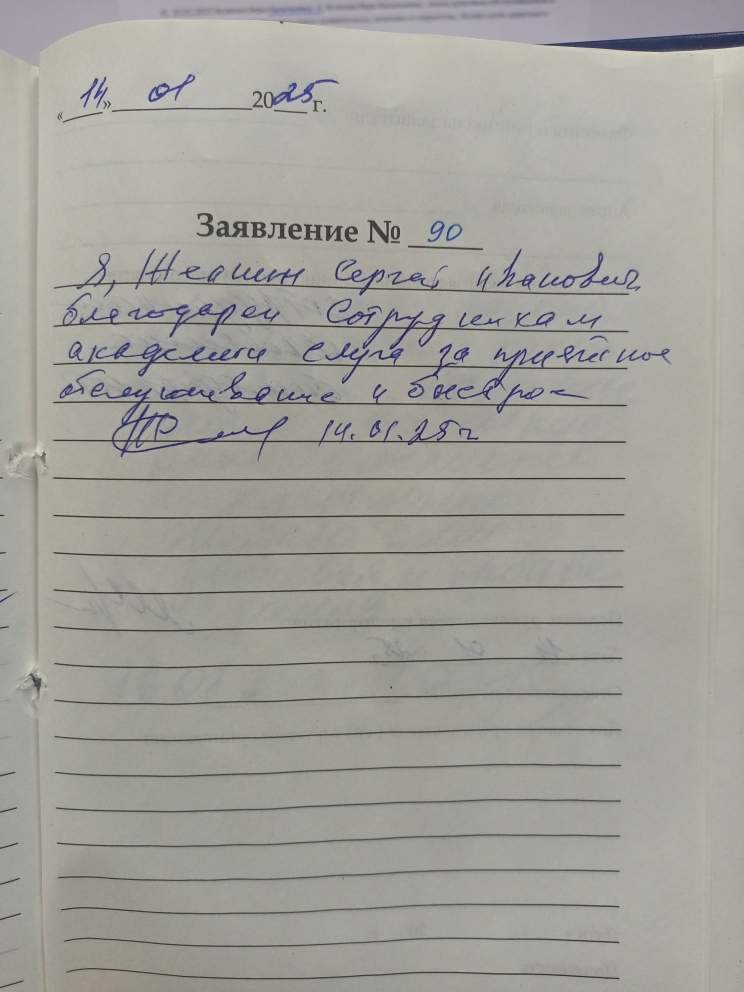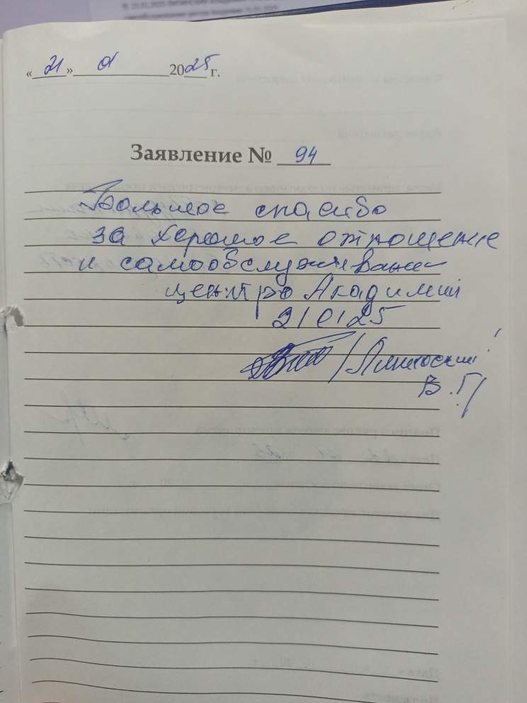 Большое спасибо за хорошее отношение и самообслуживании центра Академии 21.01.2025