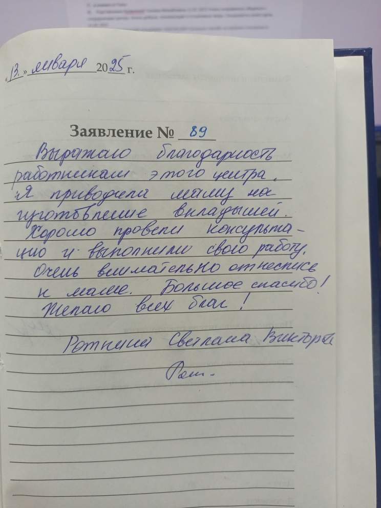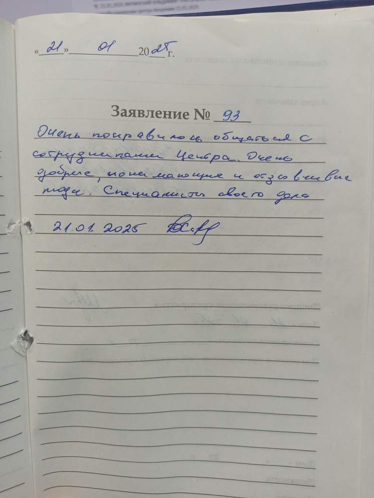 Очень понравилось общаться с сотрудниками центра. Очень добрые, понимающие и отзывчивые люди. Специалисты своего дела. 21.01.2025