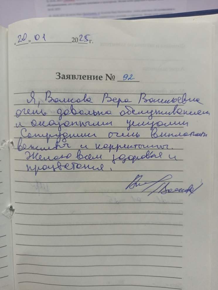 Я, Волкова Вера Васильевна , очень довольна обслуживанием и оказанными услугами. Сотрудники очень внимательны, вежливы и корректны. Желаю всем здоровья и процветания.