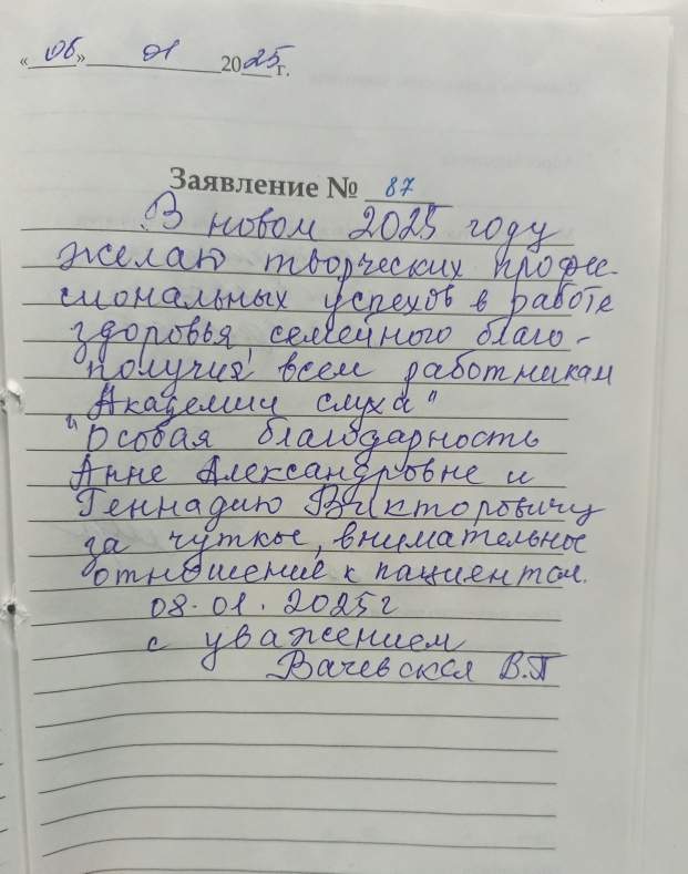 08.01.2025 В новом 2025 году желаю творческих профессиональных успехов в работе здоровья, семейного благополучия, всем работникам «Академии слуха». Особая благодарность Анне Александровне и Геннадию Викторовичу за чуткое, внимательное отношение к пациентам. 08.01.2025г С уважением Вачевская ВП