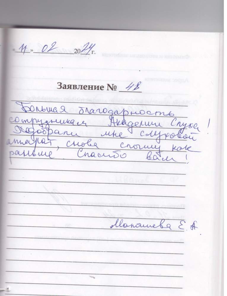 Большая благодарность сотрудникам Академии Слуха! Подобрали мне слуховой аппарат, снова слышу как раньше. Спасибо вам!