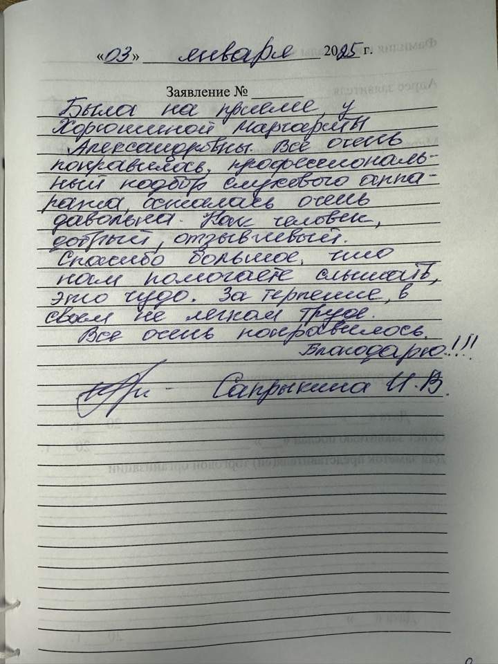 Была сегодня на приёме, очень осталась довольна работой и отношением к нам, пожилым людям. Оксана Николаевна очень внимательна и доброжелательна, что сейчас в наше время является редкостью. Спасибо Вам большое, Оксана Николаевна, здоровья Вам, счастья и успехов в Вашем не легком труде.