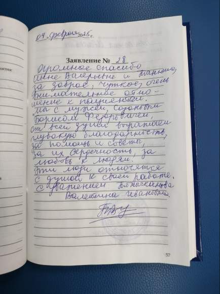 Огромное спасибо Инне Валерьевне и Танюше, за доброе, чуткое, очень внимательное отношение к пациентам. Мы с мужем, Созоновым Борисом Федоровичем, от всей души выражаем глубокую благодарность, за помощь и советы, за их сердечность, за любовь к людям. Эти люди относятся с душой к своей работе. С уважением Танычканова Валентина Ивановна