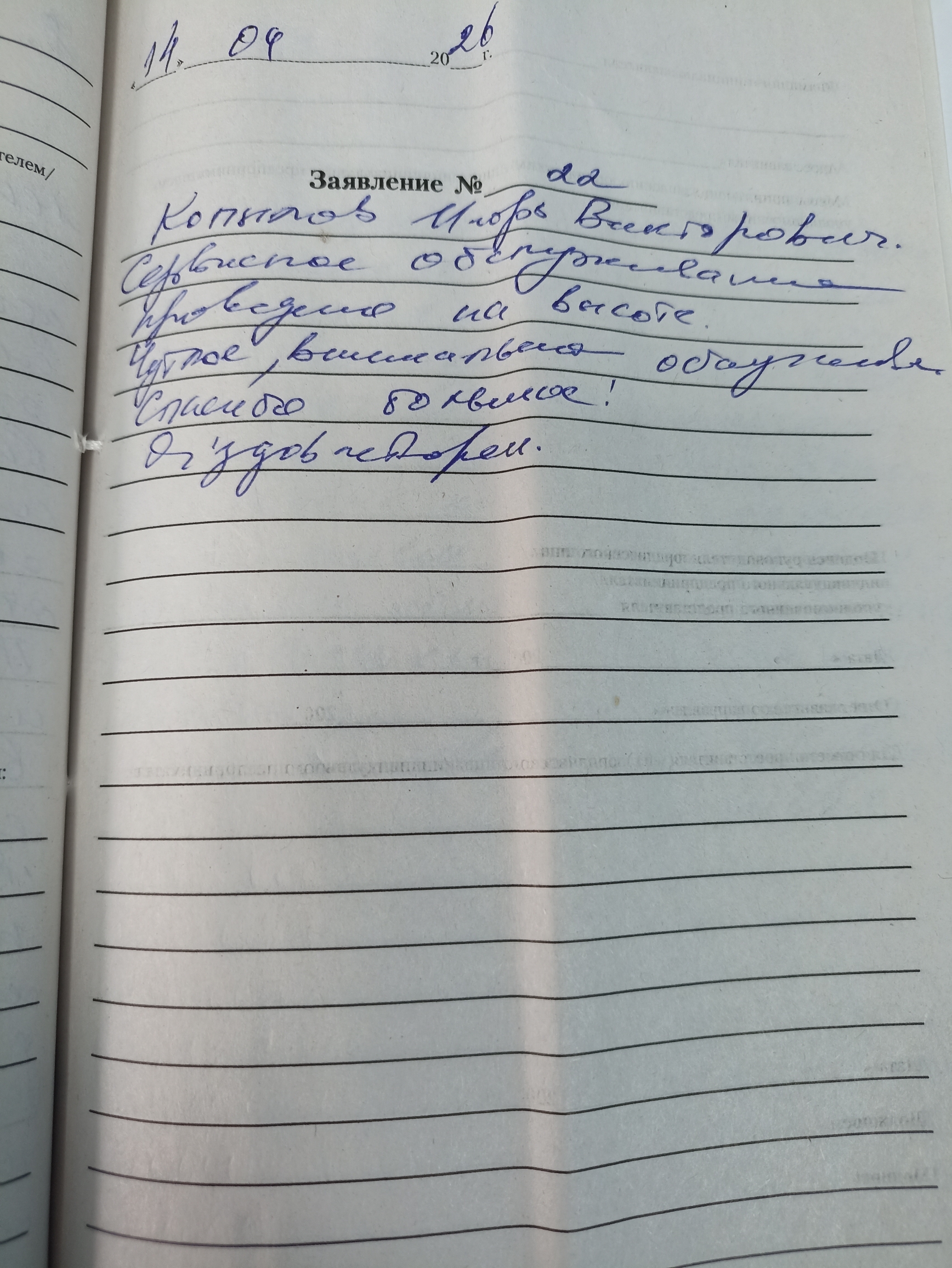 Копылов Игорь Викторович. Сервисное обслуживание проведено на высоте. Чуткое, внимательное обслуживание. Спасибо большое! Удовлетворен.
