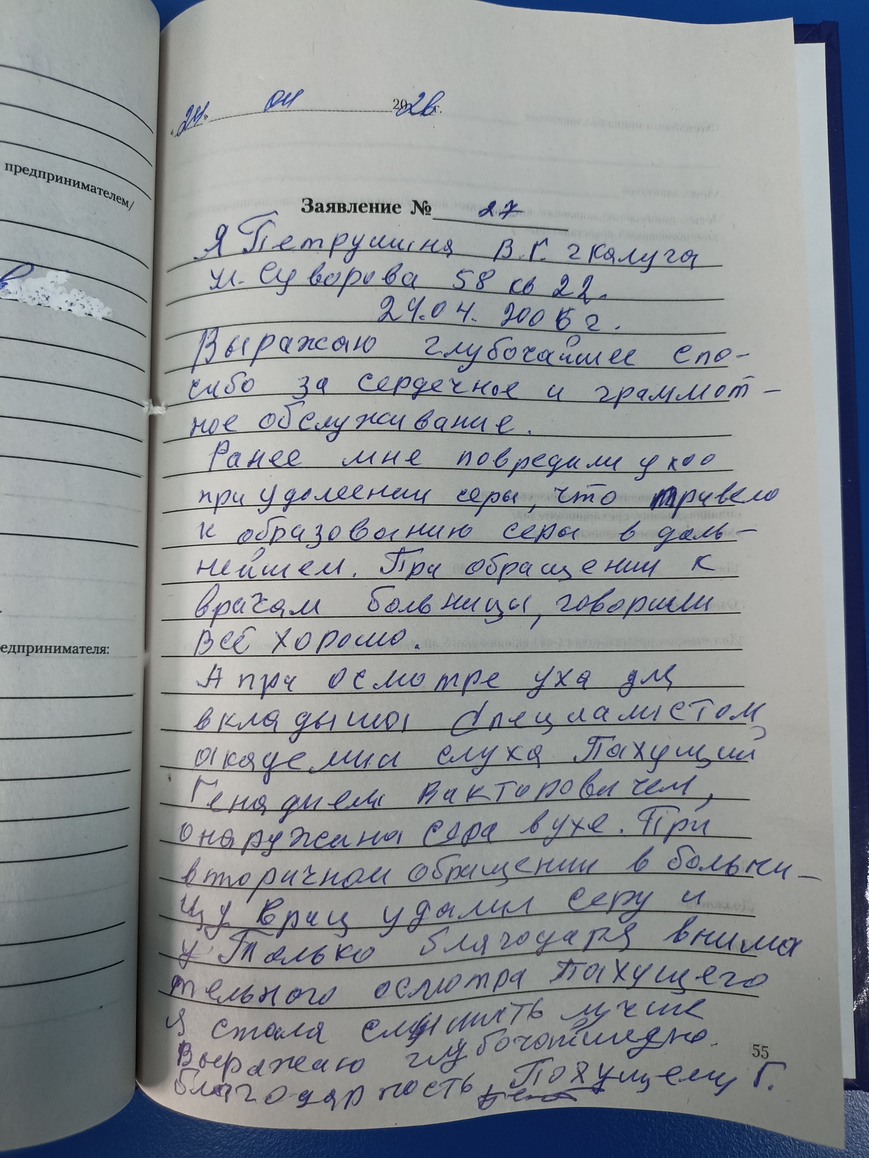 Выражаю глубочайшее спасибо за сердечное и грамотное обслуживание. Ранее мне повредили ухо при удалении серы, что привело к образованию серы в дальнейшем. При обращении к врачам больницы, говорили, что все хорошо. А при осмотре уха для вкладыша специалистом «Академии слуха» Пахущим Геннадием Викторовичем была обнаружена сера в ухе. При вторичном обращении в больницу врач удалили серу и благодаря внимательному осмотру Пахущего я стала слышать лучше. Выражаю глубочайшую благодарность Пахущему Г.В.
